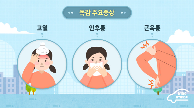 A. 독감에 감염되면 1~4일(평균 2일) 후에 증상이 나타나는데요. 주요 증상에는 발열, 기침, 두통, 근육통, 콧물, 인후통 등이 있어요. 소아는 구역질, 구토, 설사 등이 나타나기도 합니다! 발열과 같은 전신증상은 일반적으로 3~4일간 지속되지만, 기침과 인후통 등은 해열된 후에도 며칠간 더 지속될 수 있답니다.