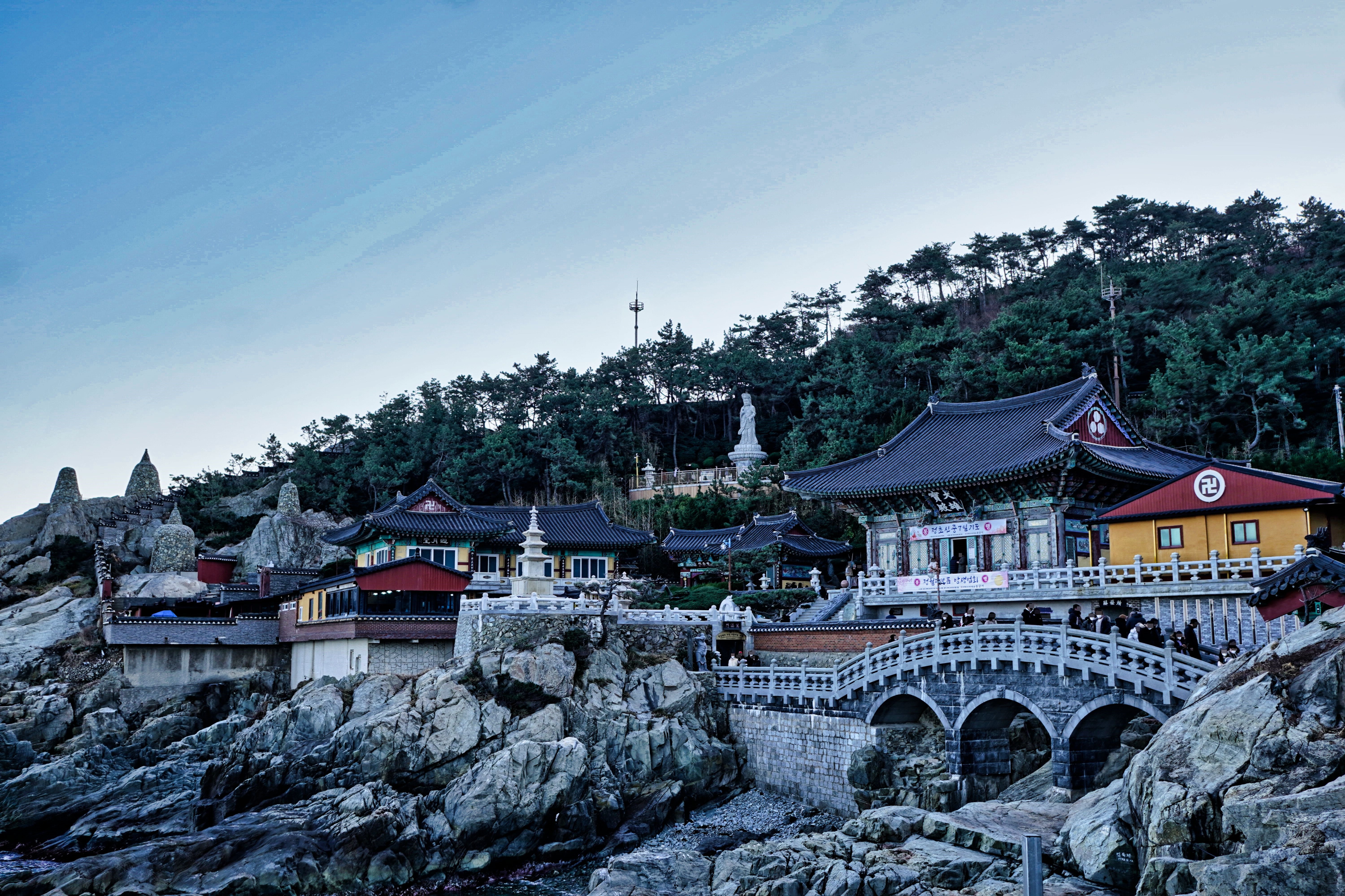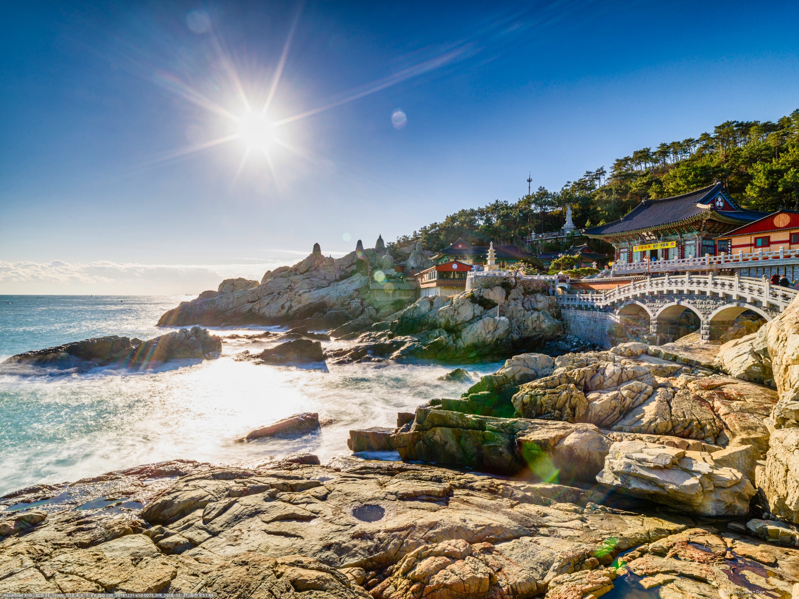 부산 기장의 시랑리 해안에 위치한 해동용궁사는 정암화상(晸庵和尙)이 바닷가에서 용을 타고 승천하는 관세음보살을 꿈에 보았다는 이야기에서 이름이 유래되었다. 산과 바다가 맞닿은 육지의 끝자락에 해동용궁사가 한 폭의 그림처럼 걸려있다.